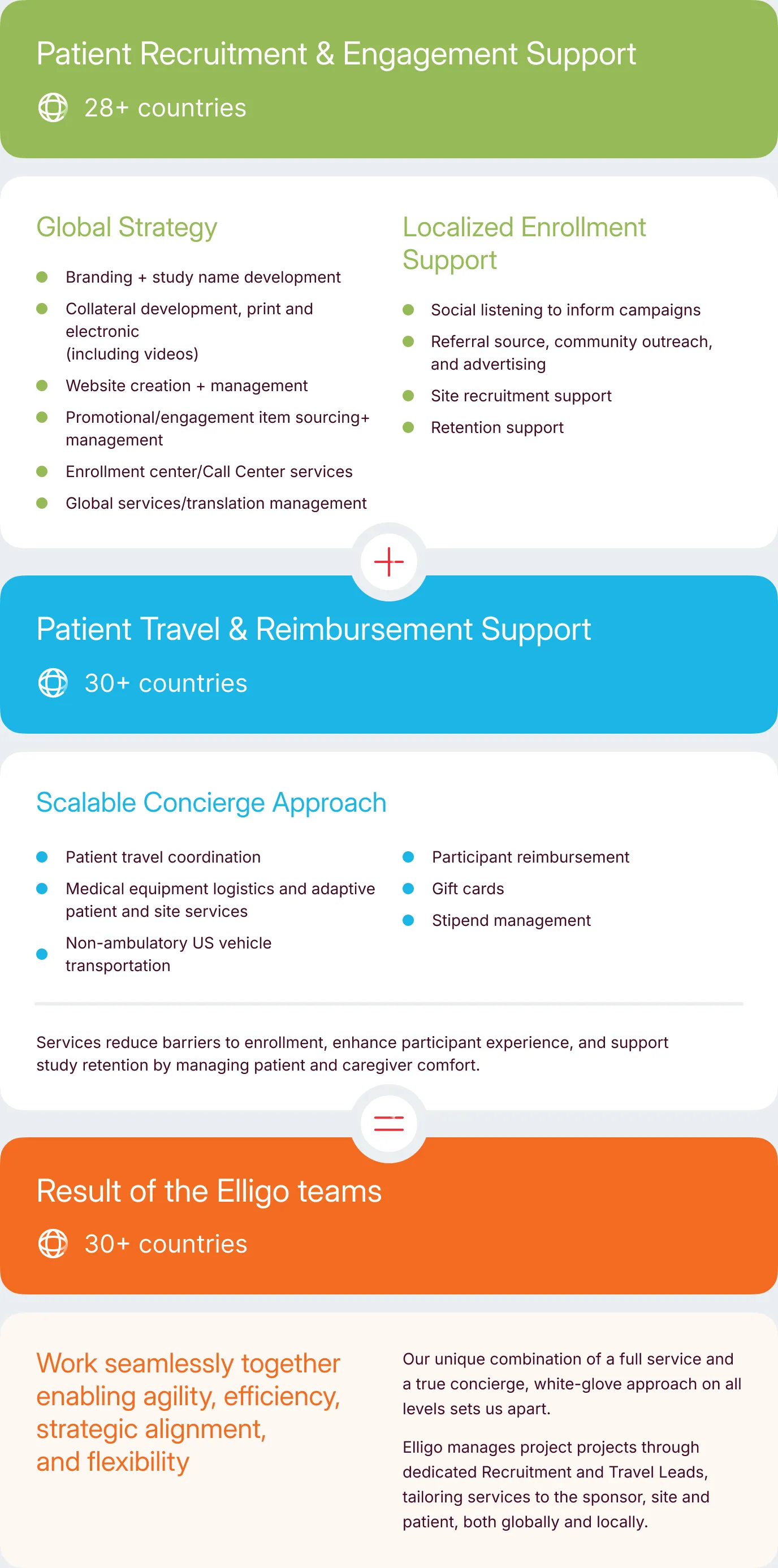 Elligo’s integrated patient recruitment and travel solutions are tailored to your study’s protocol, geography, and patient population. From branding and community outreach to transportation and reimbursement, our teams deliver coordinated, scalable global support, reducing barriers and accelerating enrollment with flexibility and precision.